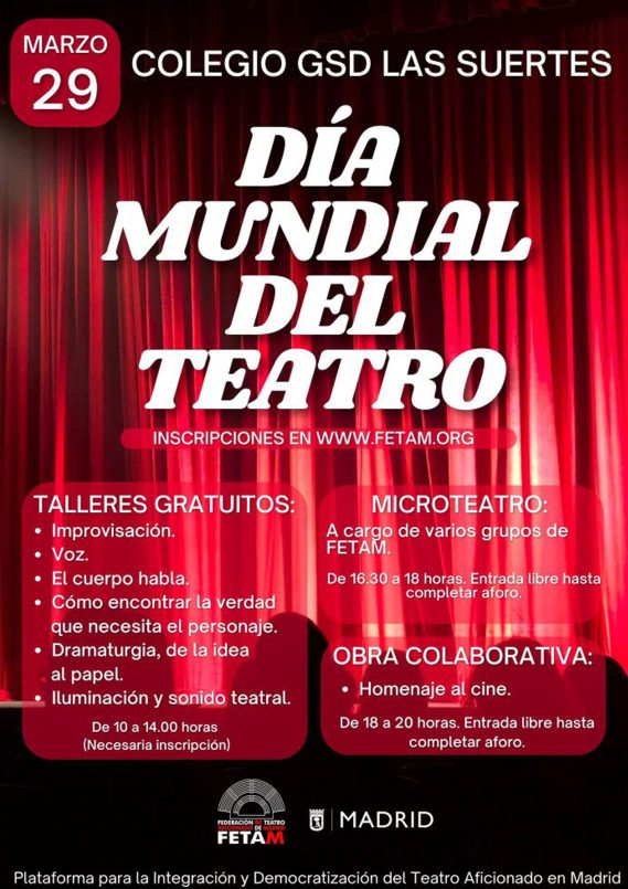El pasado día 29 de marzo de 2025, la Federación de Grupos de Teatro Aficionado de Madrid, en colaboración con el Ayuntamiento de Madrid, celebró el Día Mundial del Teatro.