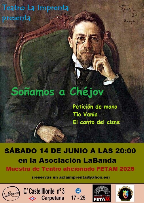 Petición de mano (sinopsis) La "Petición de mano" es una obra cómica en un acto de Antón Chéjov, donde el hipocondríaco Lomov visita a su vecino Chubukov para pedir la mano de su hija Natalia. Tío Vania (sinopsis) "Tío Vania" de Antón Chéjov narra la monotonía y frustración de los habitantes de una finca rural en Rusia, cuyas vidas se ven alteradas por la llegada del profesor jubilado Serebriakov y su joven esposa, Elena. El tío Vania se da cuenta de que ha desperdiciado su vida sirviendo a otros y lamenta sus oportunidades perdidas.  El canto del cisne (sinopsis) "El canto del cisne" es una metáfora que se refiere a la última y más grandiosa obra o actuación de alguien antes de su muerte, jubilación o el fin de una etapa. Su origen se remonta a una antigua creencia griega, popularizada en la época romana y medieval, de que los cisnes cantaban su más bella canción justo antes de morir, como una despedida melódica y gloriosa.
