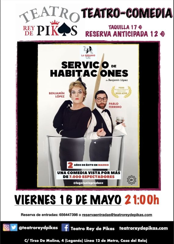 La Geranio Produce presenta la comedia «SERVICIO DE HABITACIONES» de Benjamín López, que estará en el Teatro Rey de Pikas, sito en Calle Tirso de Molina, 4 (Leganés), el próximo viernes 16 de mayo, a las 21:00h.